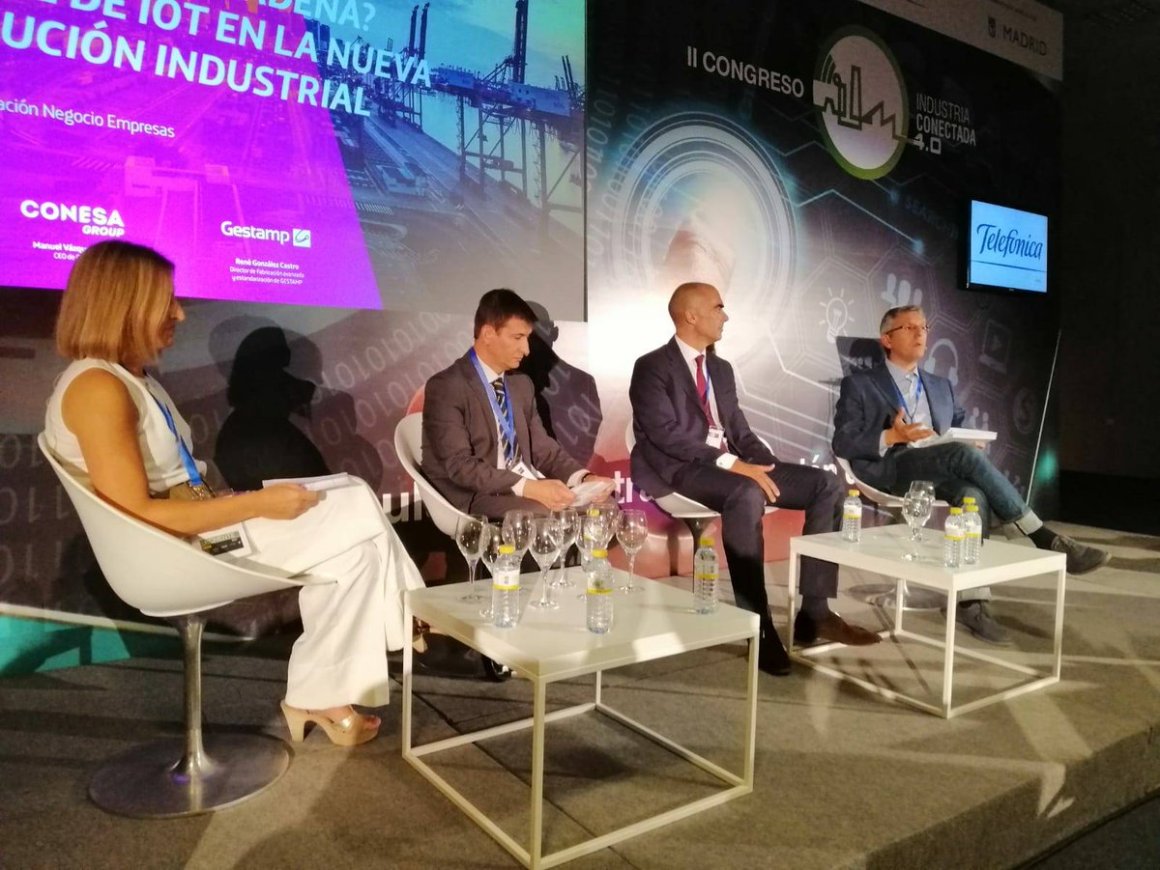 Hoy retomo el II Congreso sobre el nuevo modelo de industria para hacerme eco del debate sobre el papel de IoT en la industria conectada 4.0. Susana Cuevas, CIO del Grupo Antolín, Manuel Vázquez Calleja, CEO de Conesa y René González Castro, director de Fabricación avanzada y estandarización de Gestamp fueron los protagonistas de la mesa moderada por Agustín Cárdenas, director de Negocios digitales en Telefónica España, sobre cómo Internet de las cosas va a cambiar la forma de producir, al posibilitar procesos industriales mucho más eficientes, personalizados, con monitorización predictiva y logística inteligente, como requiere un mercado cada vez más global.