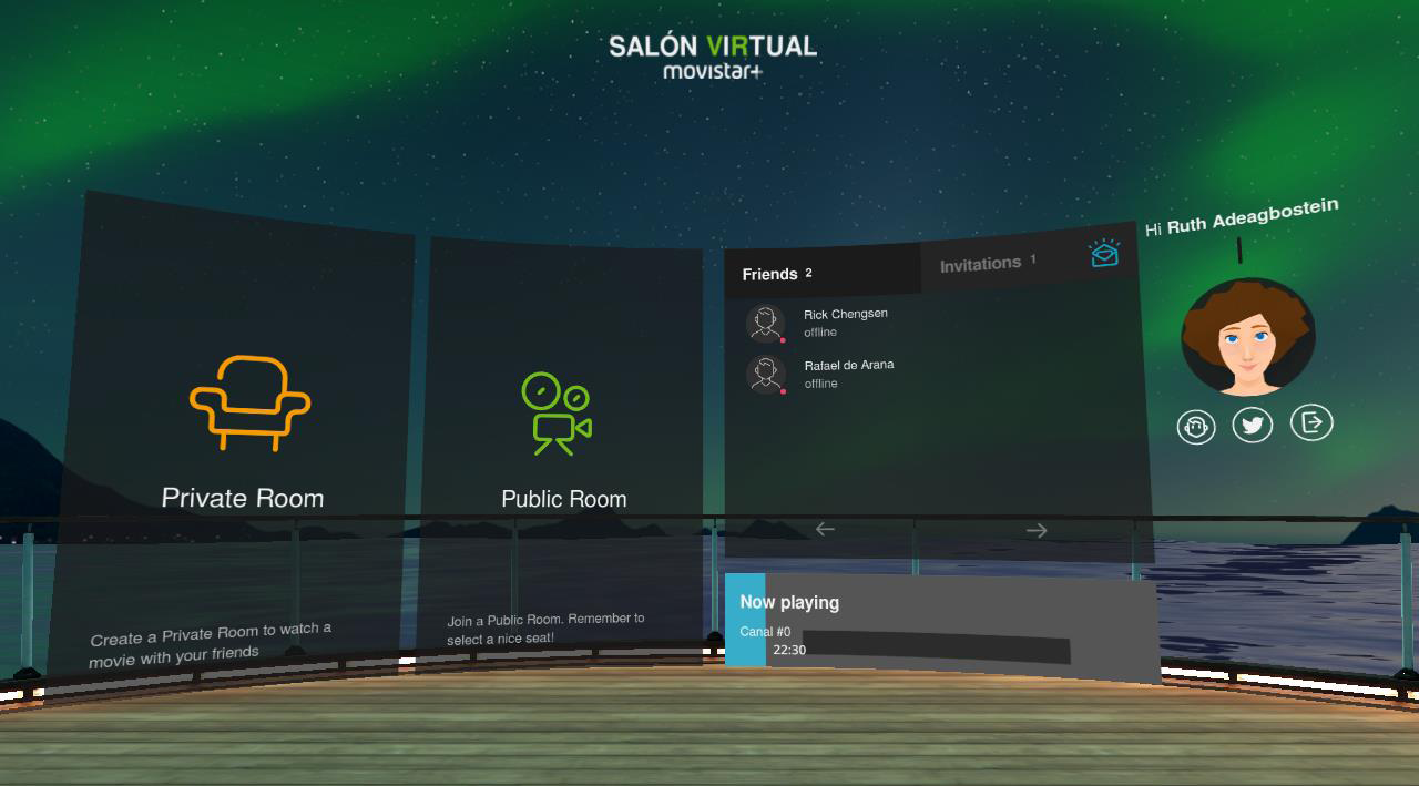 1- Por un lado, cualquier usuario de la app puede invitar hasta a cuatro amigos que estén online a su salón virtual privado, donde compartirán sillón. Estos usuarios se representan mediante avatares personalizables, pueden comunicarse entre sí a través de audio espacial y también pueden mostrar cuatro emociones básicas. Frente al sillón disponen de una pantalla de televisión de gran formato (192”) en la que se sintoniza Movistar+, desde canales en vivo hasta contenido bajo demanda.
