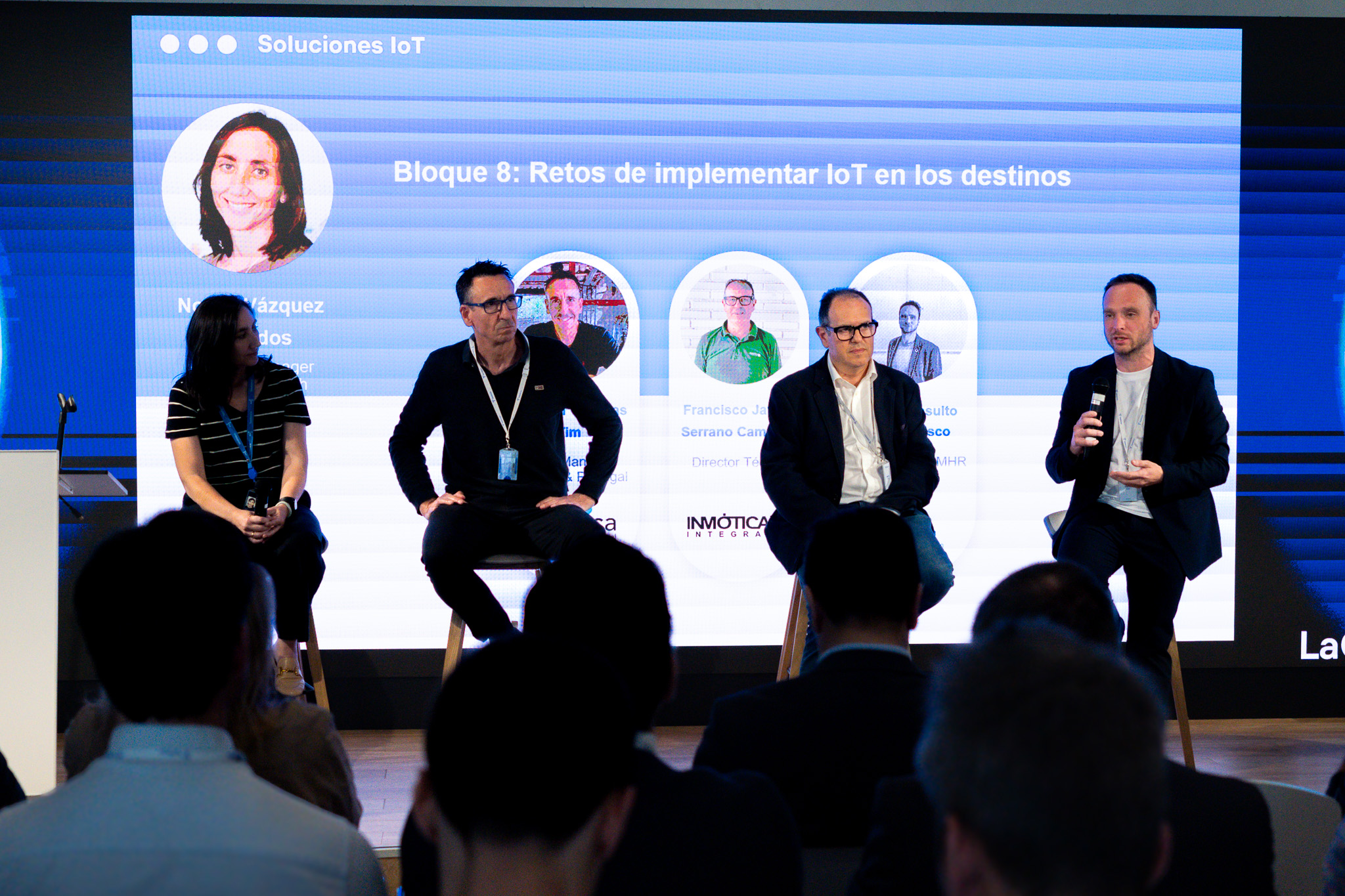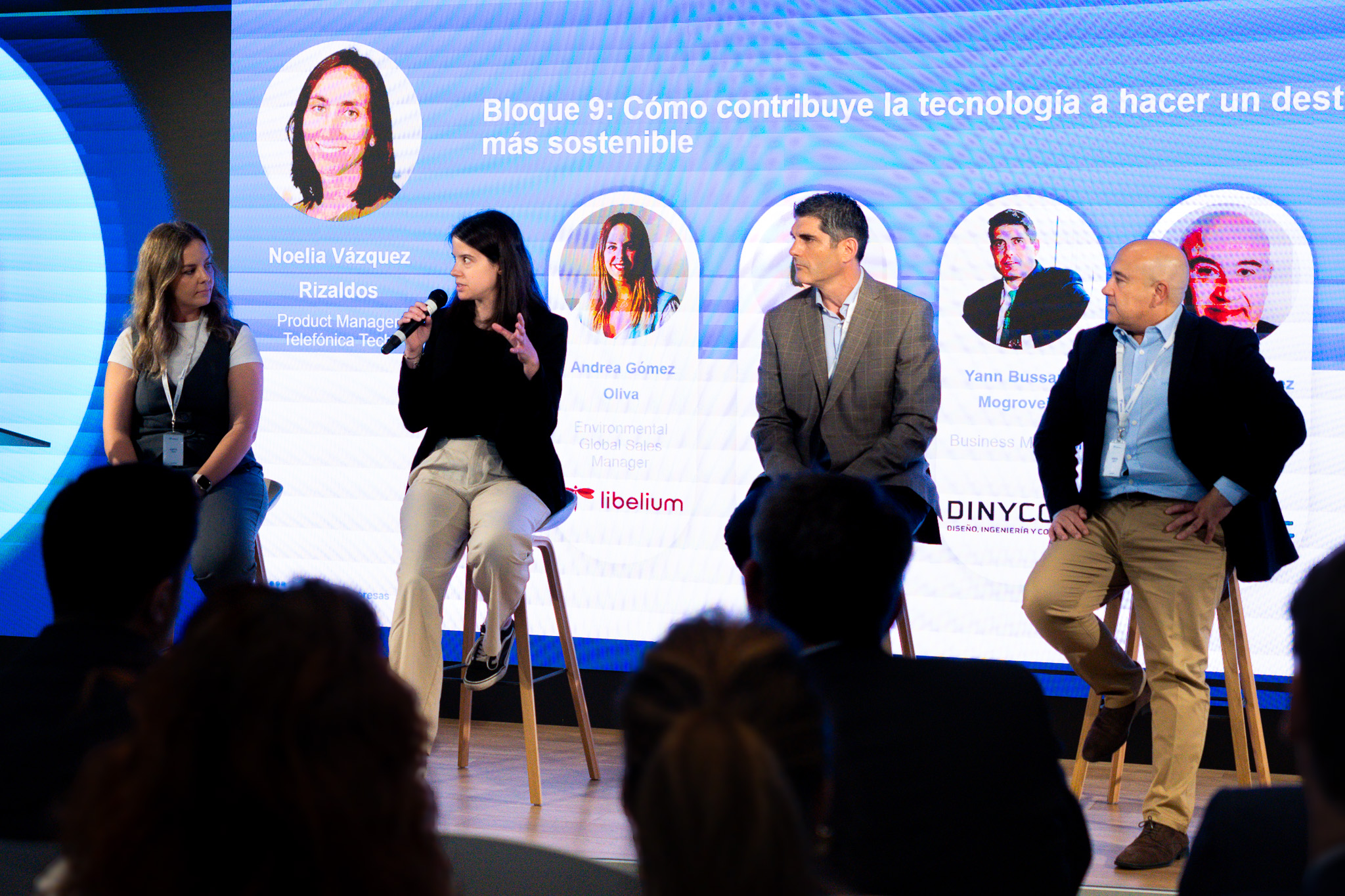 Noelia Vázquez Rizaldos, Product Manager Telefónica Tech, con Andrea Gómez Oliva, Environmental Global Sales Manager en Libelium; Sara Rodrigo, Product and UX manager en Spherag; Yann Bussard Mogrovejo, Business Manager en Dinycon, y Dionisio Martínez, Director general de Telink.