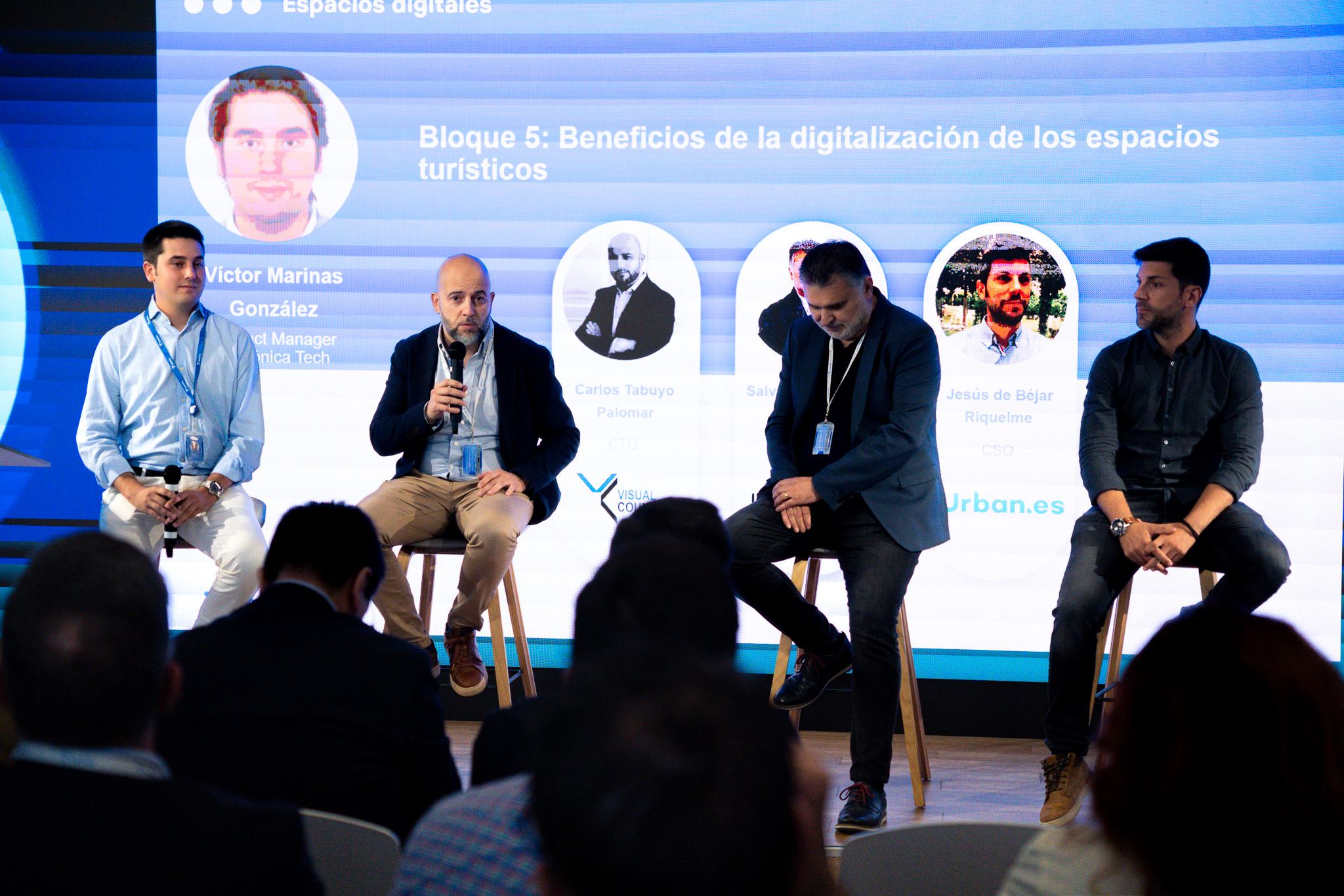 Víctor Marinas González, Product Manager Telefónica Tech, con Carlos Tabuyo Palomar, CTO en Visual Counter; Salvador Benaiges Agost, CEO en Insyde, y Jesús de Béjar Riquelme, CSO en iUrban.es.