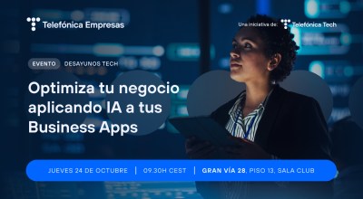 Evento ‘Optimiza tu negocio aplicando IA a tus Business Apps’En este encuentro, contamos con expertos del sector que presentaron la apuesta de Telefónica en el desarrollo de la IA en aplicaciones de negocio de nuestros clientes. También, mostraron de forma práctica y basándose en tecnología Microsoft, cómo conseguir incrementar los índices de satisfacción de cliente, mejorando por tanto la fidelización y a la vez optimizando la dedicación de los empleados o agentes que los atienden. 24 de octubre a las 9:30 h en el edificio de Gran Vía 28 de Madrid
