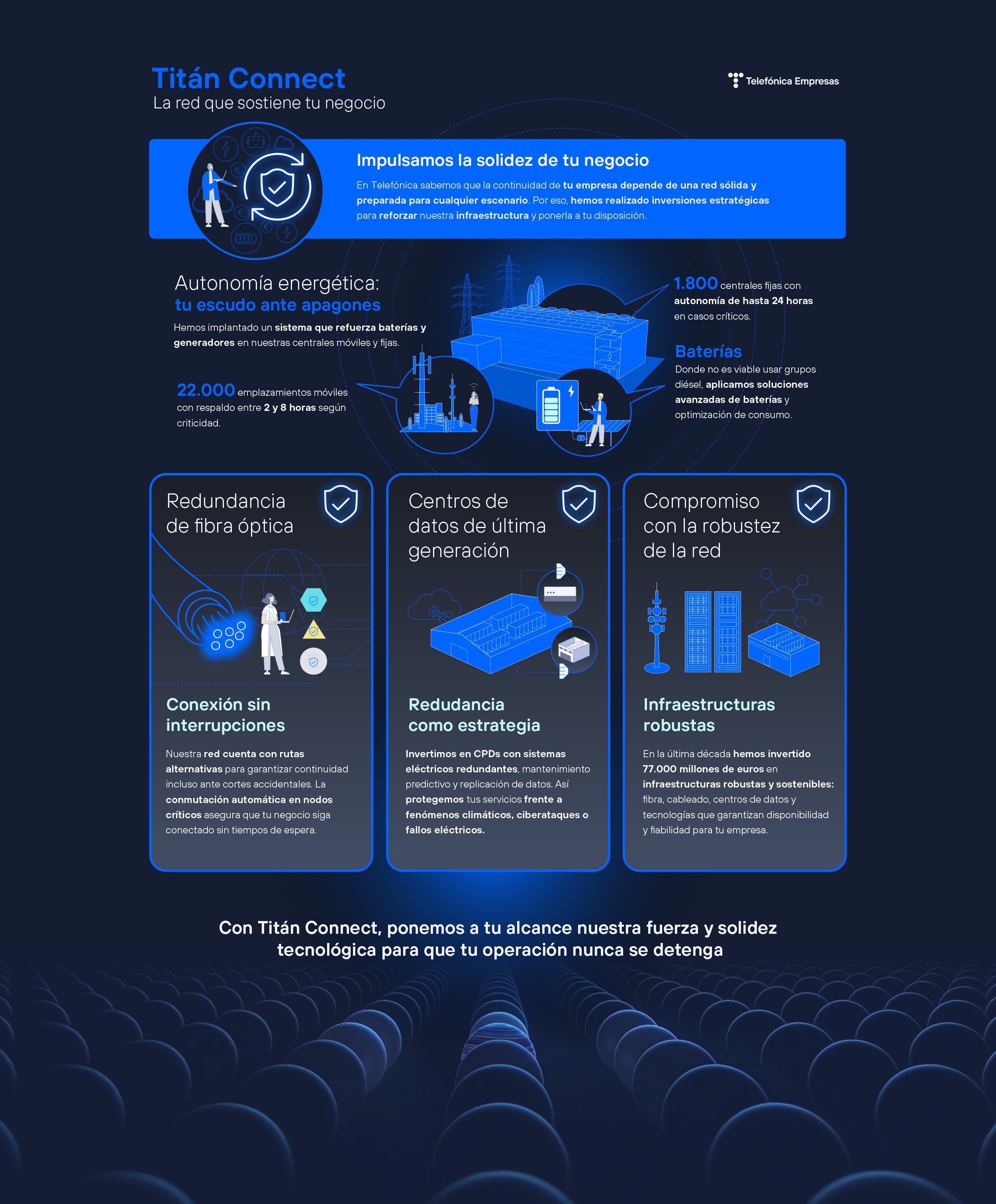 Eventos como apagones generalizados, DANAs o caídas globales de software pueden afectar infraestructuras críticas y proveedores clave, con impacto transversal en las empresas. Telefónica está reforzando la resiliencia de su propia infraestructura (baterías, generadores, rutas redundantes, planes de contingencia) y, al mismo tiempo, ofrecemos a los clientes soluciones de conectividad de respaldo y servicios de seguridad que reducen la probabilidad de interrupción y aceleran la recuperación.