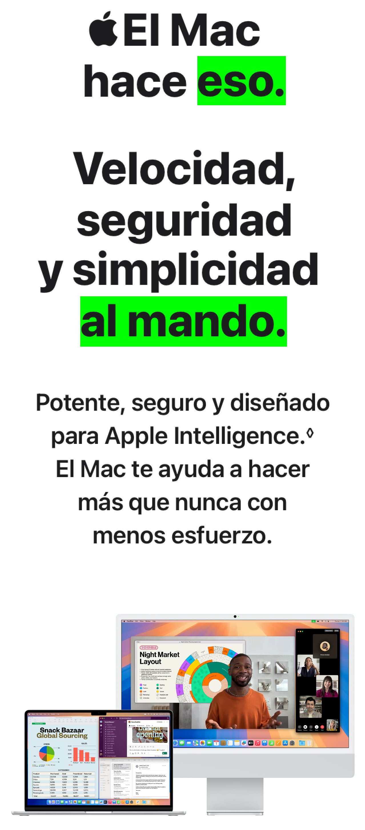 Impulsado por el revolucionario chip Apple silicon, Mac está diseñado para Apple Intelligence y optimizado para flujos de trabajo con IA.