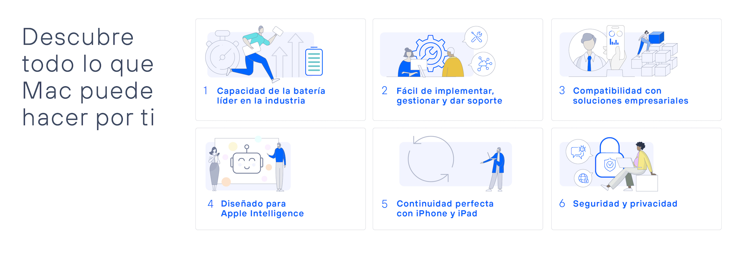 Configura tus productos Mac fácilmente y desde cualquier lugar mediante implementación sin intervención (zero touch) con Apple Business Manager y MDM, lo que permite gestión remota, seguridad avanzada y compatibilidad con las principales herramientas corporativas como Office, VPN y aplicaciones empresariales.