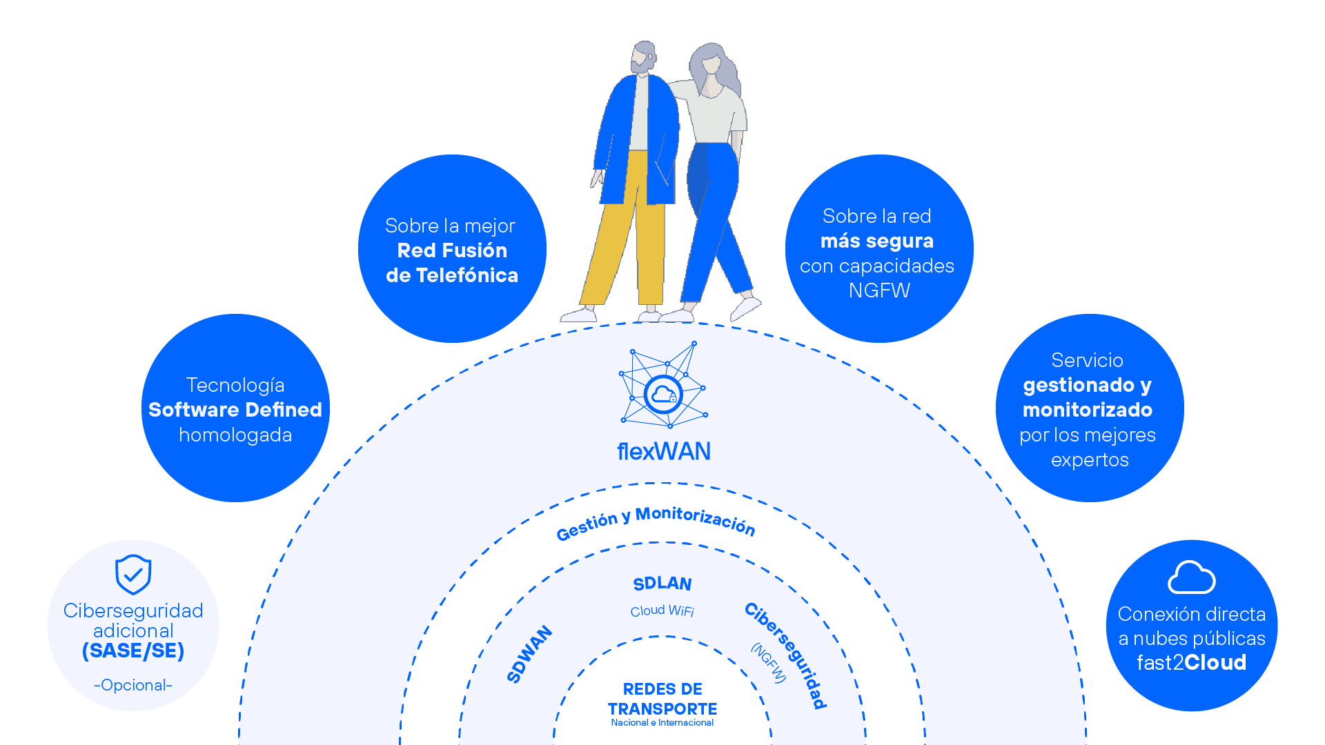 Gracias a flexWAN, empresas y organizaciones pueden afrontar los retos del presente y del futuro relacionados con el ámbito de la conectividad WAN y Seguridad. Un servicio que incluye una gestión global de toda la red empresarial de una compañía.